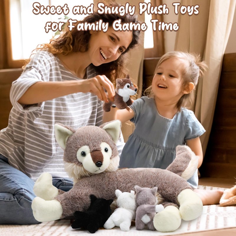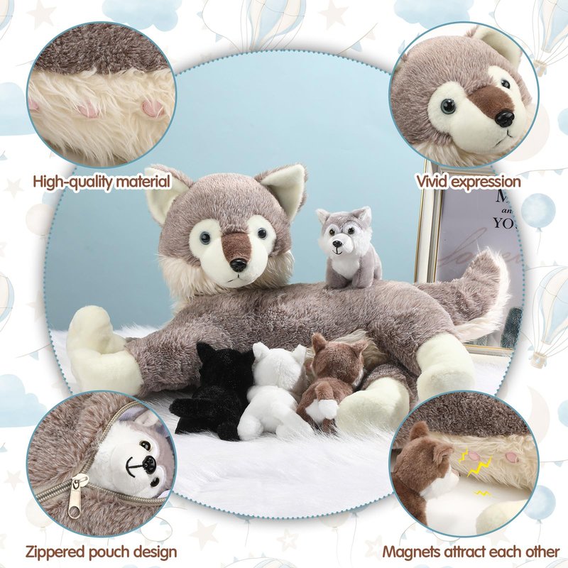 - Fun and Educational: the wolf mother has a zipper on her back, open the zipper to help her leave 4 cute baby wolves, you can play breeding games with your kids or friends and experience the process of raising babies; Besides, the nipples of the mother wolf and the nose of baby wolf both have magnets that can attract each other, so that you also can experience the process of breastfeeding babies