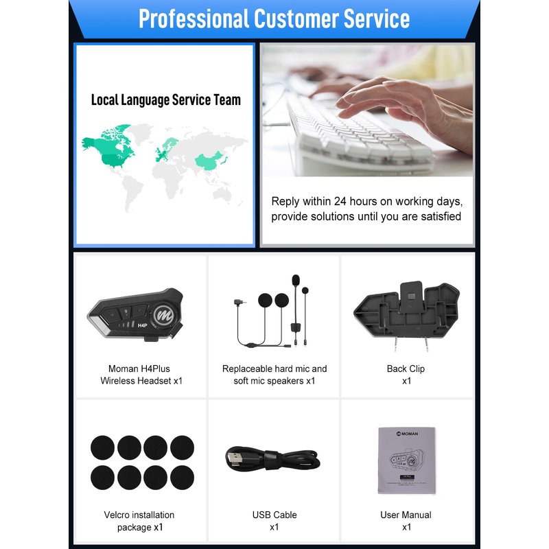 - 【1000mAh large battery & Type-C charging】Built-in an 1000mAh battery, Moman H4 Plus supports 32 hour continuous working and 360 hour stand-by on a single charge. You could have audio, data transfer and charging via one Type-C port on intercom, avoiding messy cables connection.
