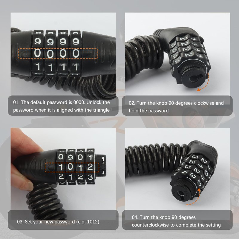 - Password Setting: The process of setting the password for our helmet lock is very simple, [1] the initial password is "0000", point it at the triangle to open the lock; [2] rotate the knob labeled "SET" 90 degrees clockwise and hold the password; [3] Set your password point in the triangle; [4] Turn the knob back to the original position to complete the setup.