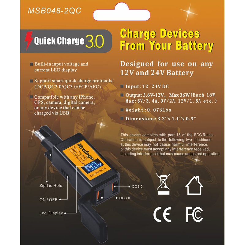 - Dual USB output: 5V 4.8A total (Each 2.4A), Input: 12V - 24V battery, with on/off power switch