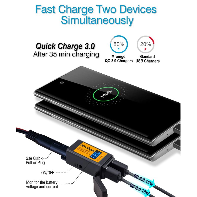 SAE To USB Adapter with Voltmeter and Ammeter, Mroinge Motorcycle Quick Disconnect Plug with Dual USB Charger 2.4A & 2.4A for your any Smart phone