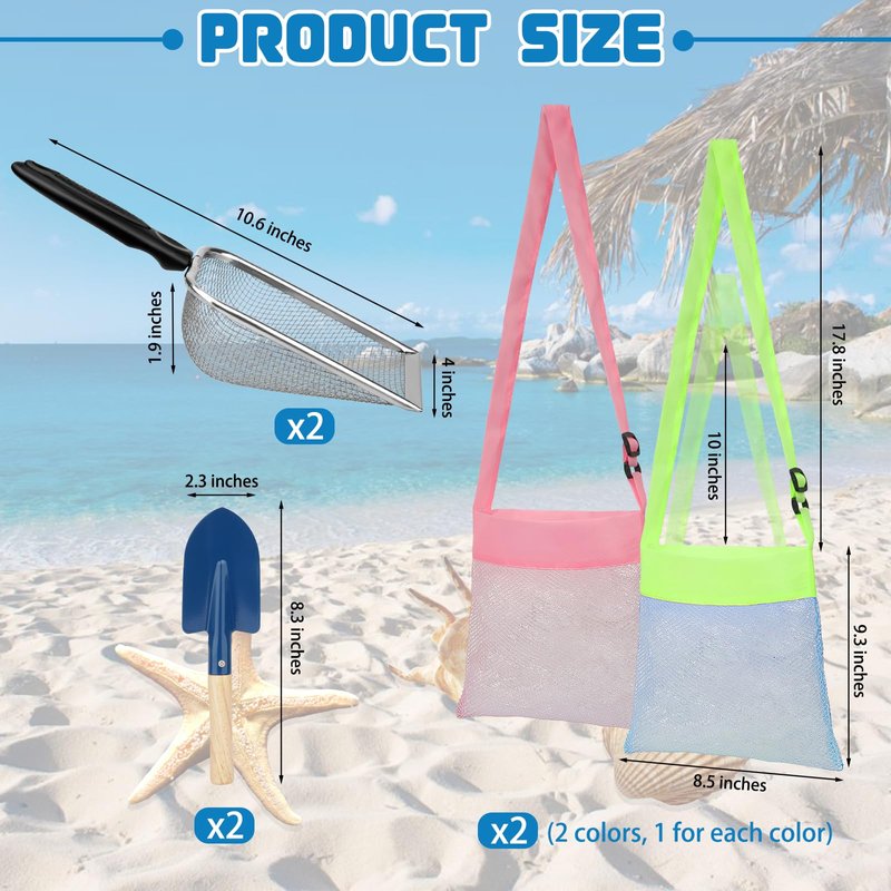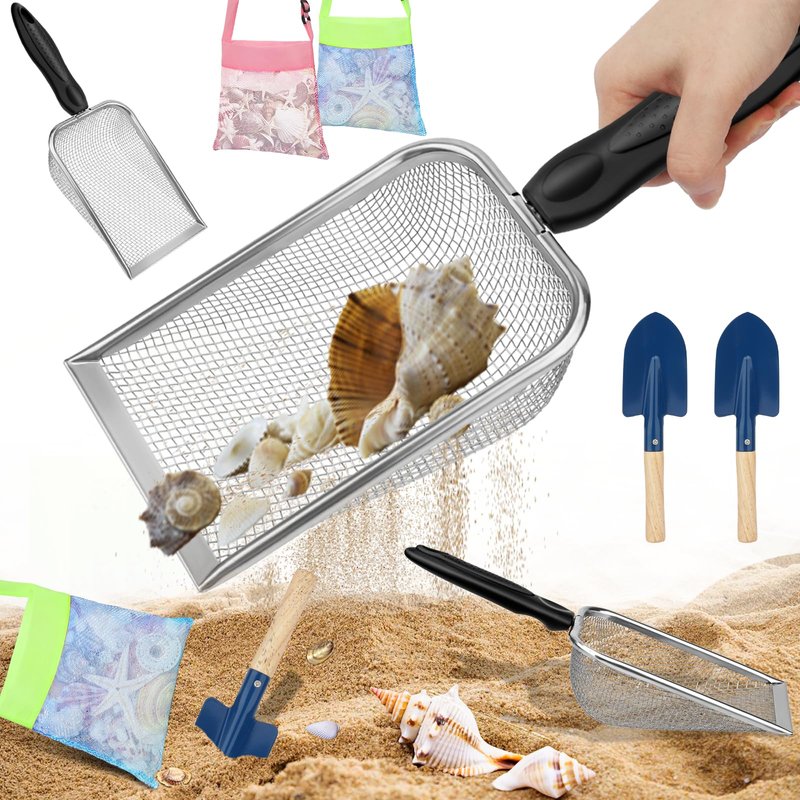 - Quality Materials: our sand toys are made of quality materials that are safe and easy to clean, and are essential items for the beach; the shark tooth sifter is made of high-quality stainless steel with a delicate and smooth mesh, and can also be used as a household cat litter shovel, the seashell collecting bags is breathable and wear-resistant, the shoulder strap is adjustable, the carrying capacity is strong, and the shovel is durable and can handle a lot of digging work