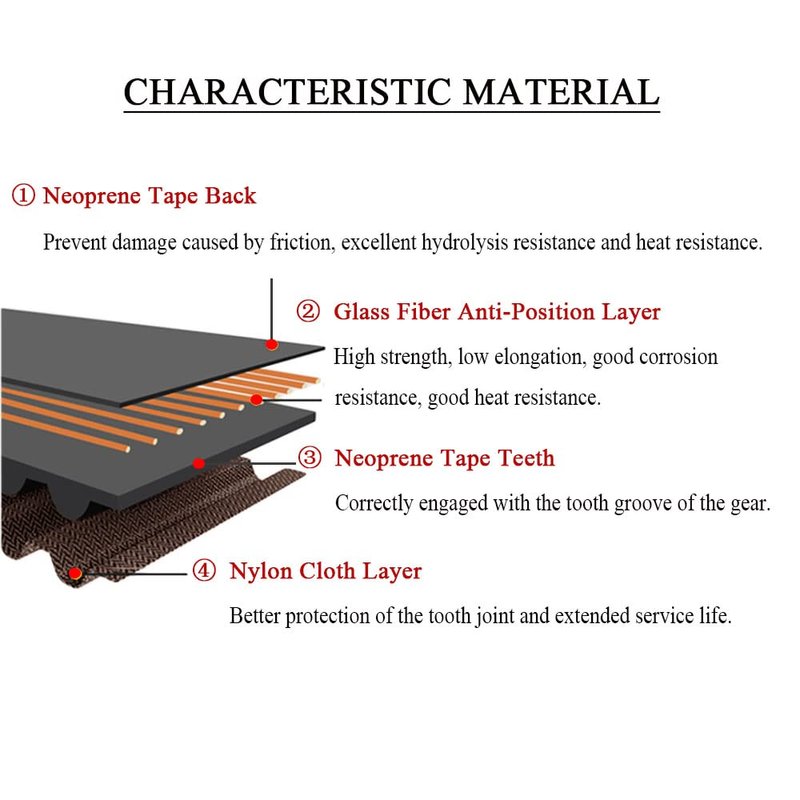 - Material: Neoprene rubber with fiberglass core & Anti-wear nylon tooth surface