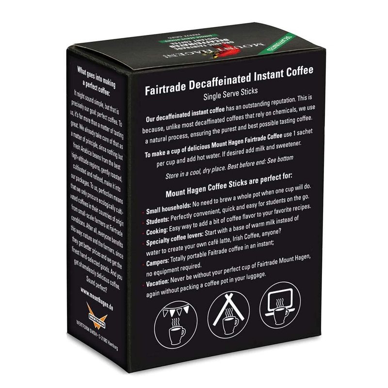 - AWARD-WINNING: Mount Hagen consistently tops lists of best instant organic coffees, becoming many a connoisseur's favorite joe-on-the-go. (Google it, and you’ll see!) These single-serve decaf sticks are packed with the same outstanding coffee as our award-winning jars- made from 100% USDA Organic, Fairtrade Arabica beans with 99.99% of the caffeine extracted using our patented CO2 decaffeination process. Mount Hagen coffee is also gluten-free and certified OU Kosher.