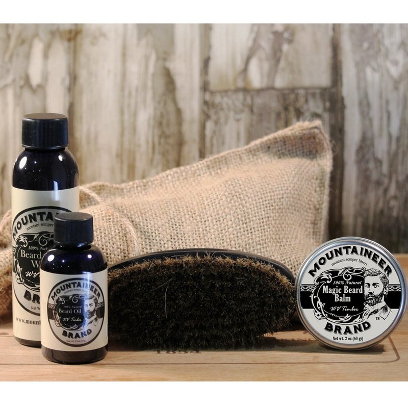 Mountaineer Brand Beard Grooming Care Kit Gifts for Men | Beard Oil (2oz), Conditioning Balm (2oz), Wash (4oz), and Brush | Mens Mustache Growth Kit, Essential Beard Kit for Men | WV Timber Scented