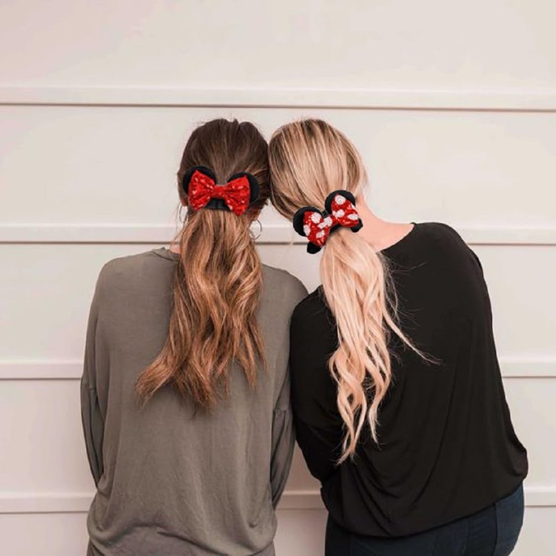 - Good Alternative to Mouse Ears & Stay in Place: Our mouse ears hair ties for ponytail can be as an alternative to Mickey ears since mouse ears headbands may give you/your girls a headache. The mouse ears hair scrunchies are nice for when it was too windy for headbands or on a day with lots of riding. They stayed on well.