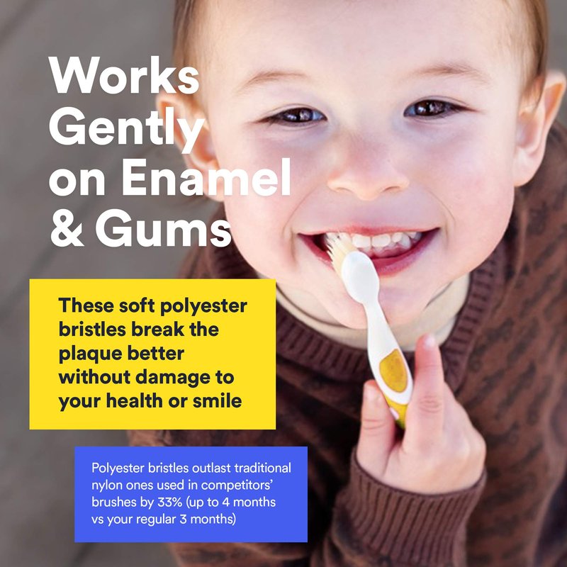 - ULTRA SOFT AND LONG LASTING Polyester bristles are extra soft, and gentle enough for young teeth and gums. Polyester is a longer lasting fiber than traditional nylon bristles, so you can hold on to your brush for up to 4 months – 1 month longer than a typical toothbrush! Ergonomic grip makes these toothbrushes easy to handle – even for small hands!
