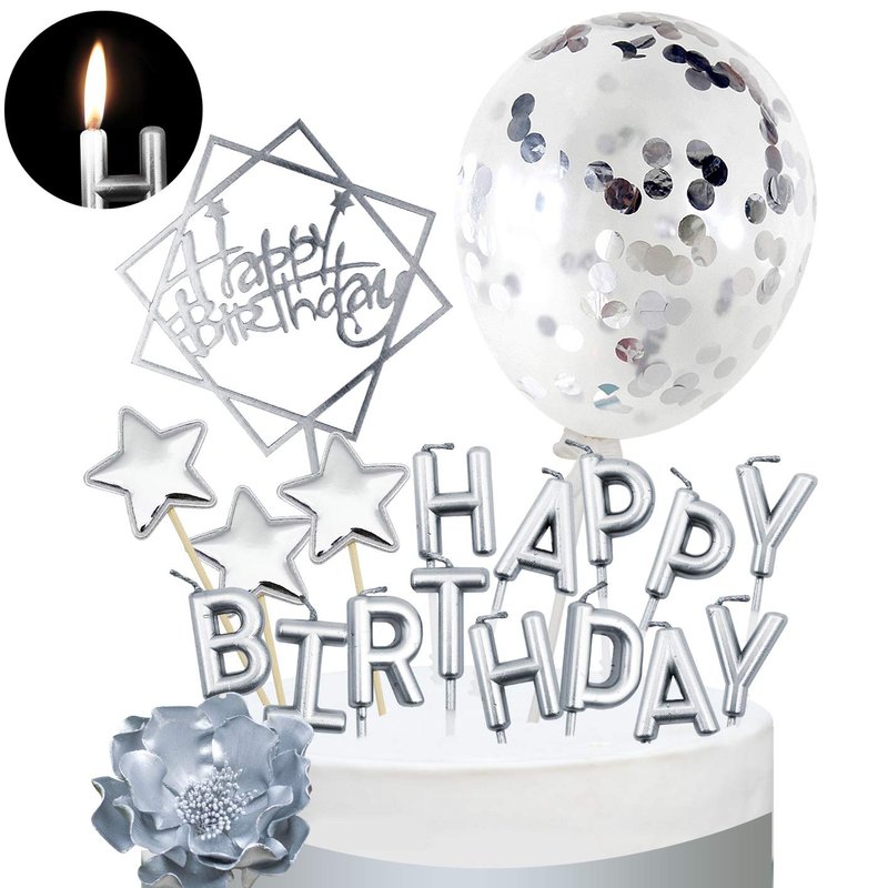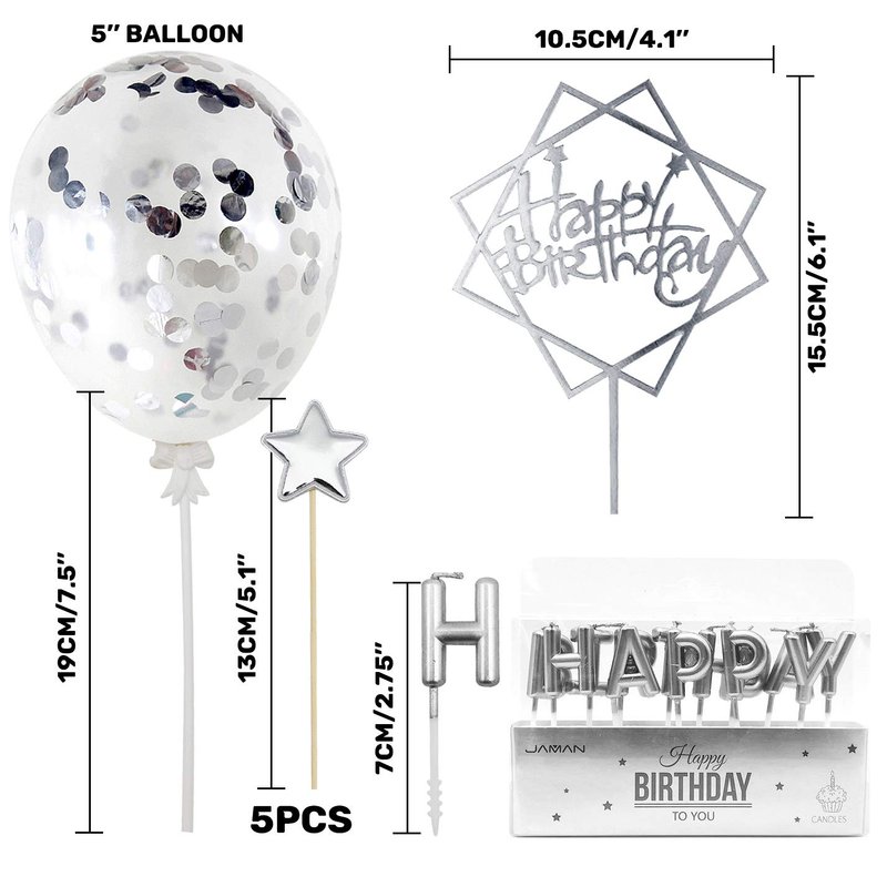 - ♕ Package: Sliver Happy Birthday Banner + Slivery Confetti Balloon Topper + HAPPY BIRTHDAY Candle Topper + 5pcs of Star Topper. Fits best on 6inch-10inch cakes.