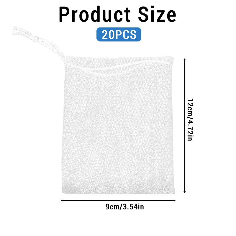 - The package includes: 20Pcs mesh soap bag. The design features a convenient drawstring closure made of white ribbon for extra security. Hang and store your favorite soap without creating a mess in your bathroom. Size: Approx. 12 * 9/ 4.7 * 3.5inch. Enjoy the comfort and durability of our top-class materials.