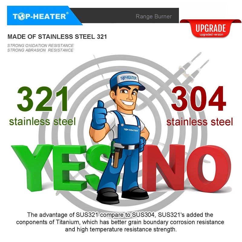 - 【PREMIUM SUS321 TUBE MATERIAL】Our MP21YA electric range burner element is made of stainless steel 321. Compared with stainless steel 304, stainless steel 321 is added the composition of titanium, which has higher temperature resistance, stronger oxidation resistance, better wear resistance and lower deformation during electric stove burners working.