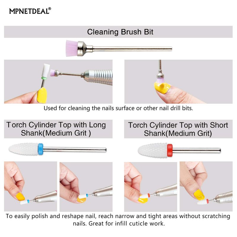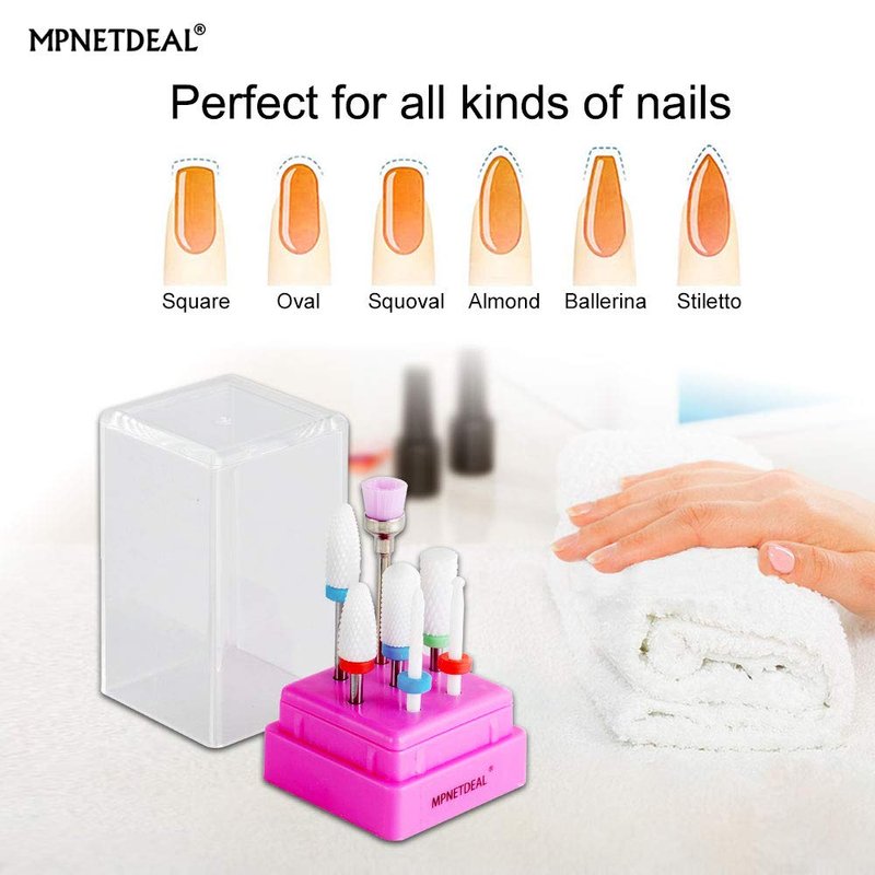 - ②【Multifunctional & Time saving 】 This MPNETDEAL nail drill bits set includes 6 different types of Ceramic Nail Drill Bits and 1 piece Nail drill bit brush. You can sharpen, grind, neaten, carve, smoothen, polish, reshape, and take off the gel polish , dip powder and acrylic layer nails very quickly and efficiently. Please usually use it on the lowest setting before redoing the manicure or pedicure.