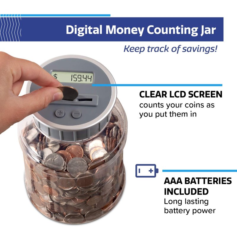 This digital coin bank keeps track of change on its digital LCD screen and updates your total each time you put in a coin. Batteries included!
