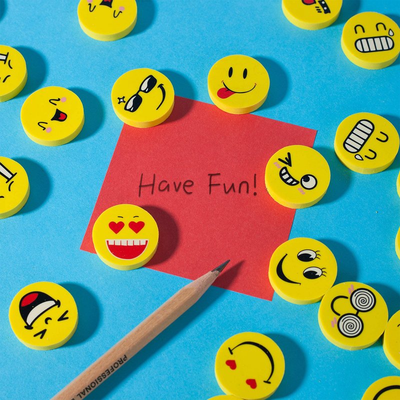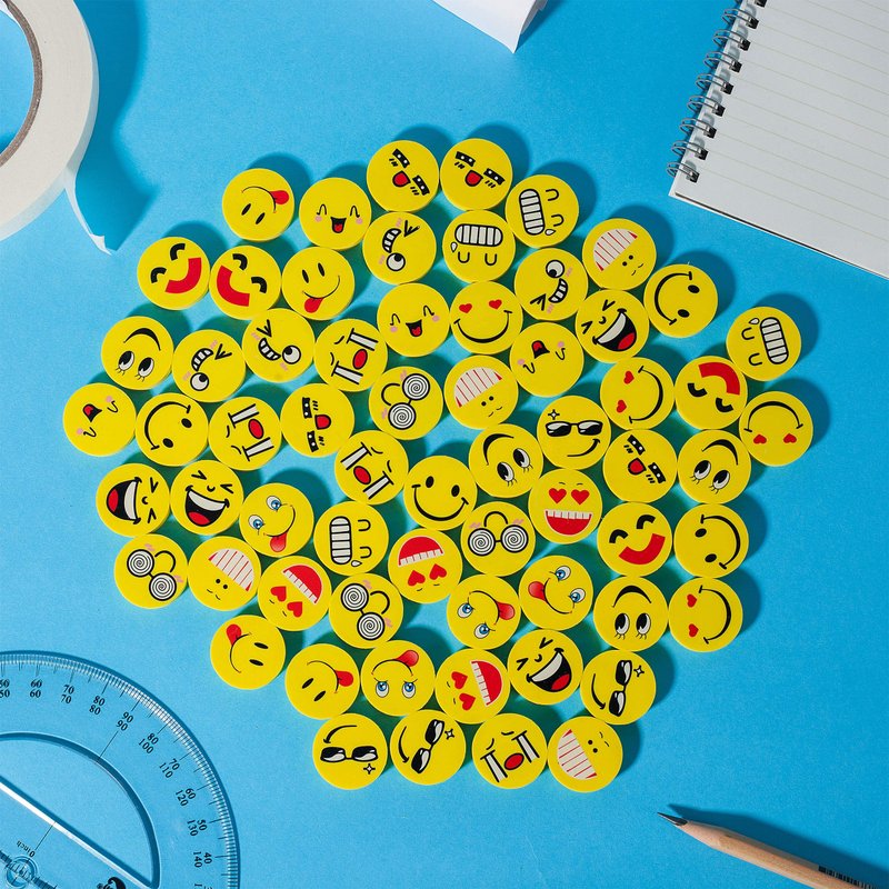 - Pack of 64 Smiley pencil erasers, 4pcs per style