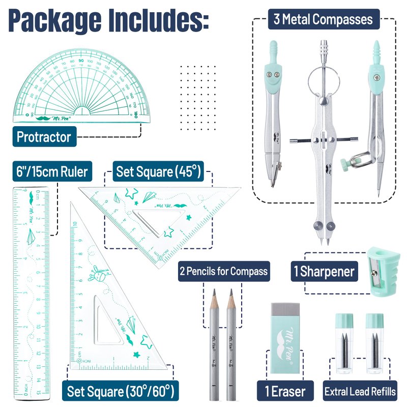 - Mr. Pen geometry kit contains 3 compasses, 2 triangles, a 6-inch ruler, a protractor, and 2 pencils, ensuring you have all the tools you need for precise geometric work.