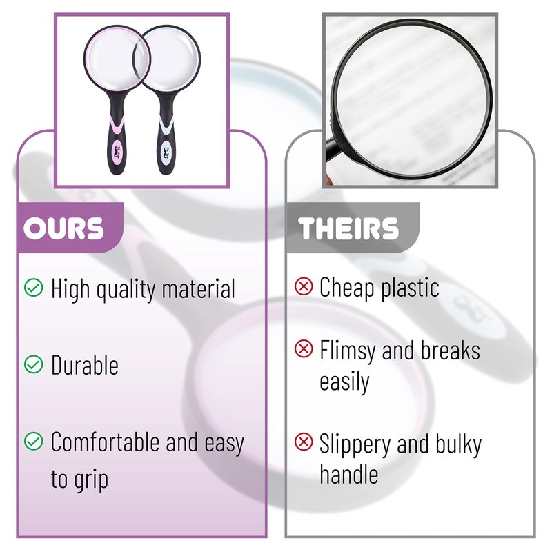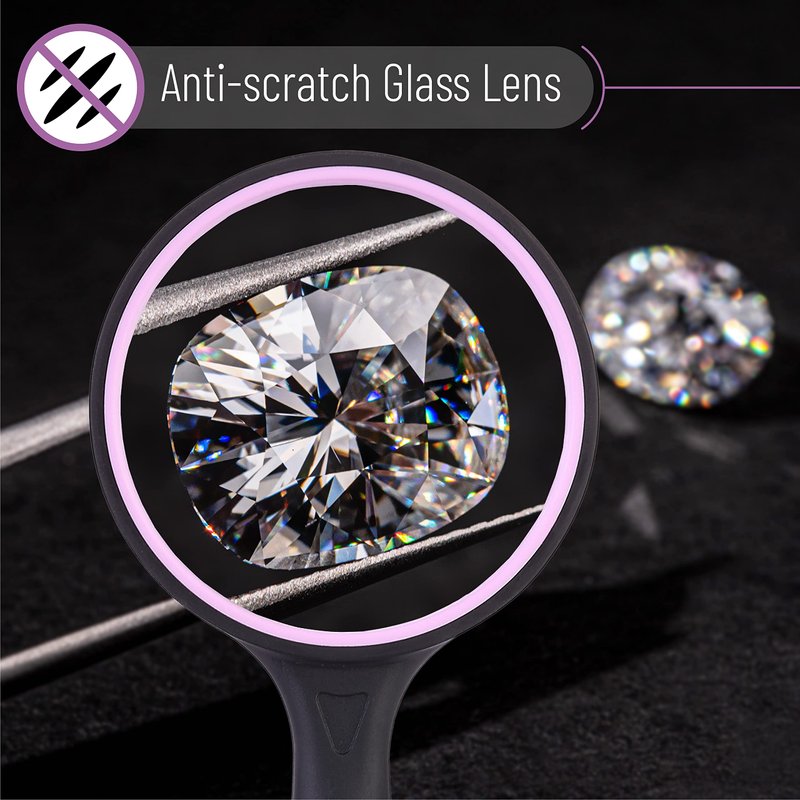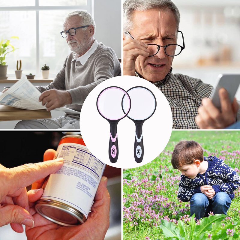 - The handle with ergonomic rubber is soft and comfortable, and the non-slip rubber coating helps you grip it easily. Our magnifier glass lens's thick and sturdy rubber frame ensures it stays perfect.