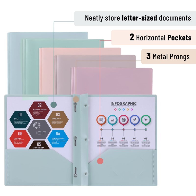 Mr. Pen- Plastic Folders with Pockets and Prong, 5 Pack, Muted Pastel Colors, Pocket Folders, File Fasteners, 2 Folder, Two