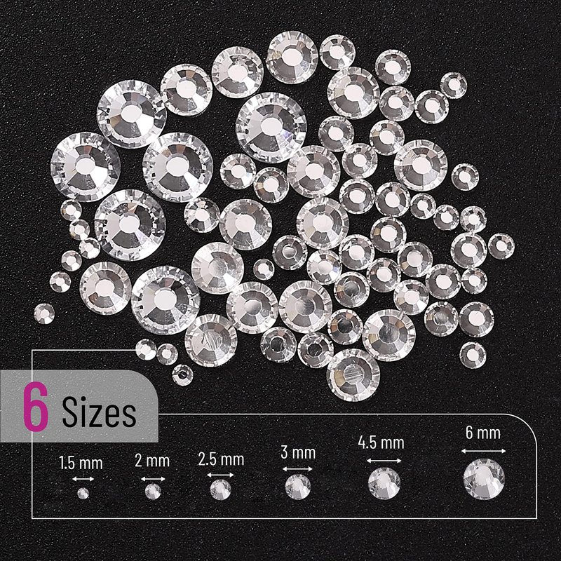 - The mixed sizes of round glass gems can meet your DIY needs; you can use them to decorate your nail art, eye makeup, body art, hairpins, phone cases, etc.