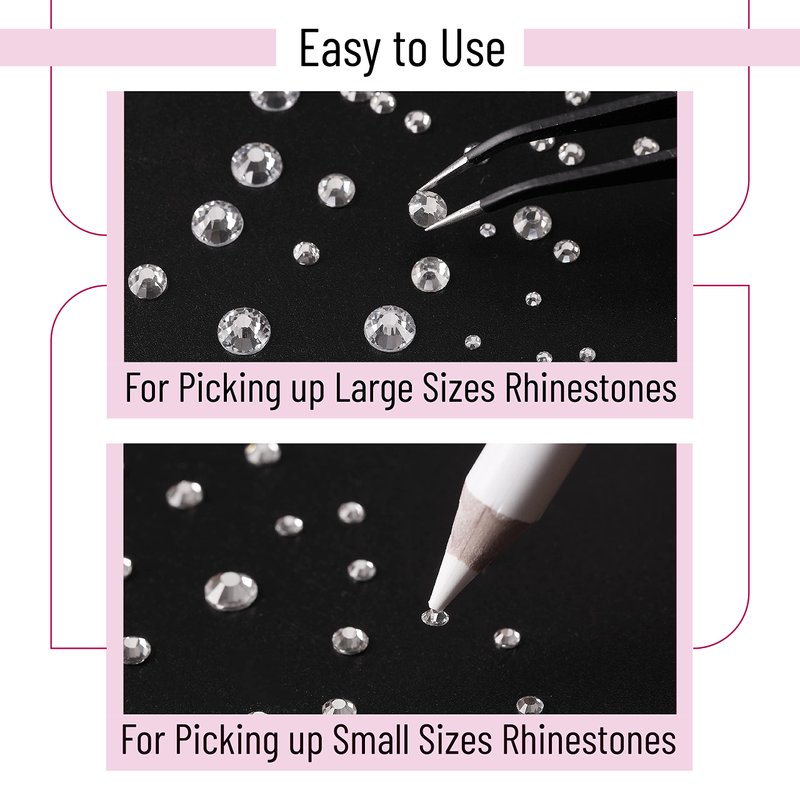 - The tweezer tips are tapered and well-aligned for grasping and handling rhinestones firmly and easily which makes it suitable for placing gems according to sizes.