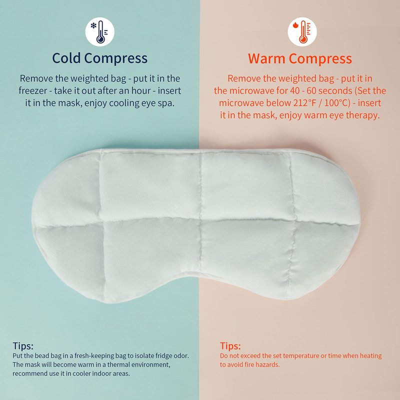 - At-home Eye Spa: With a concealed zipper, the glass bead bag is detachable. You can freeze the bead bag for cold compress, or heat it in microwave for warm therapy to stimulate circulation and ease soreness. Use it as a normal eye mask without the beads bag. Read the manuals for more detail
