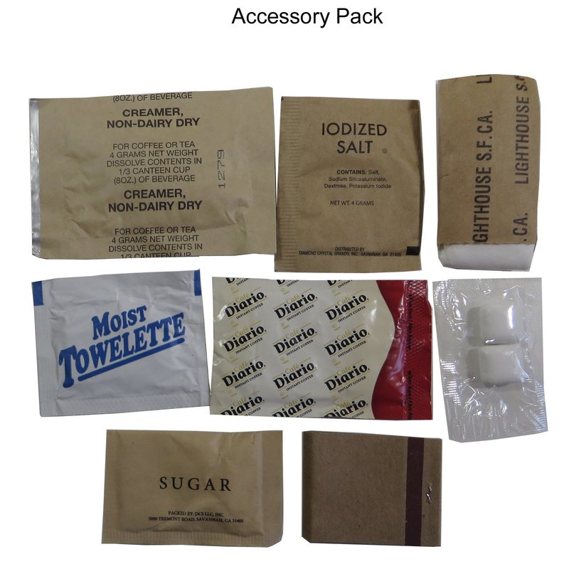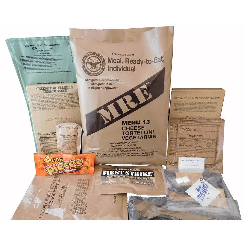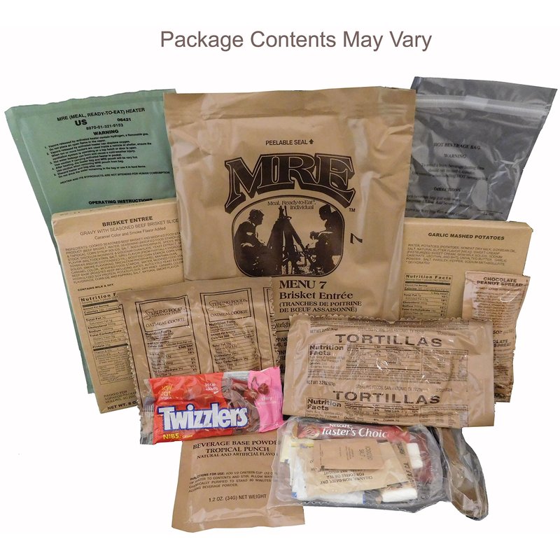 Genuine Military Meal-Ready-to-Eat (MRE) with 2015 pack date or later. Meals typically include water-activated flameless ration heaters, entree, side dish, snacks, beverage powders, and accessory packs. Please note, flameless ration heaters are not packaged with some meal entrees. Average 1250 calories per meal. Entrees are selected at random by Amazon. There are approximately 24 different entrees that may be shipped, so entree may not match the entree shown in the photo. Please note, these are military surplus meals and we can’t control contents packaged with meals. Contents will vary depending on product availability to manufacturer at time of packaging. Military Surplus MREs are not fresh packed. Meals are normally held in climate controlled storage for 12 to 24 months before being released to the field. For the longest shelf life, meals should be stored at or below room temperature. Typical expected shelf life is between 1 to 4 years depending on storage conditions. Please note: MRE package contents will vary based on product availability and specifications at the time of packing. All package contents are subject to substitution, omission, and addition of different products including flameless ration heaters, beverages, accessory packs, condiments, sides, and entrees. Contents frequently vary from what are shown in photos. There are three primary manufacturers who package or assemble MRE Contents -- Ameriqual, Sopakco, and Wornick. Internal meal packages may be packaged by other commercial food suppliers.