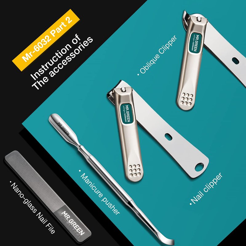 - The accessories used in this series:Nail Clipper, Oblique Clipper, Olecranon toenail clipper, Cuticle Nipper,Nano-glass Nail File, Eyebrow Tweezer, Cuticle Remover, Cuticle Pusher,Ear Pick.Two different accessory combinations are available.