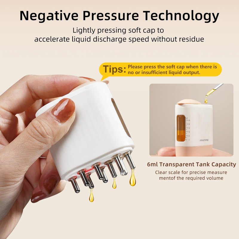 - 【Technology & Safe Materials】The hair oiling applicator is equipped with patented negative pressure technology, which can easily adjust the speed of oil or liquid discharge by pressing the top soft cap without residue. The hair oil massager storage tank is made of high-quality PCTG material, overall fuselage made of TPU material.