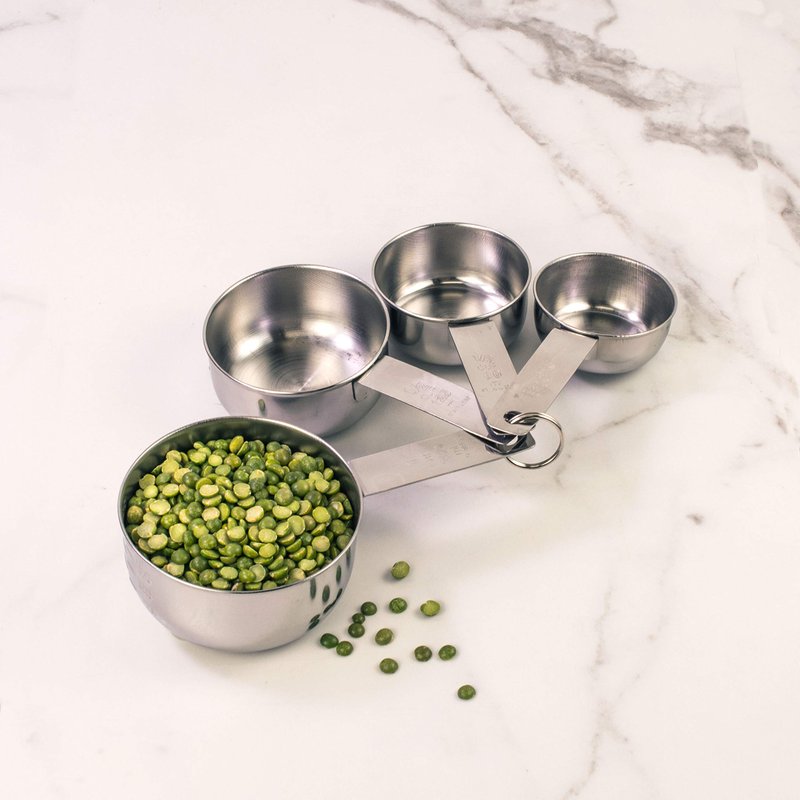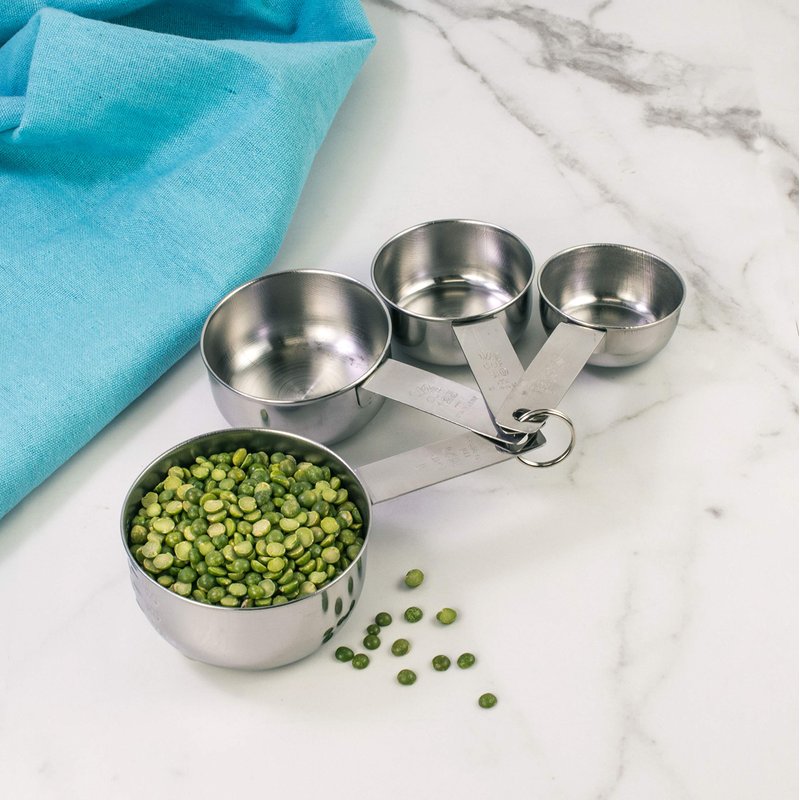 - Measurements clearly engraved on each measuring cup handle; set includes 4 standard kitchen measurements; 1/4, 1/3, 1/2, and 1-cup measurements