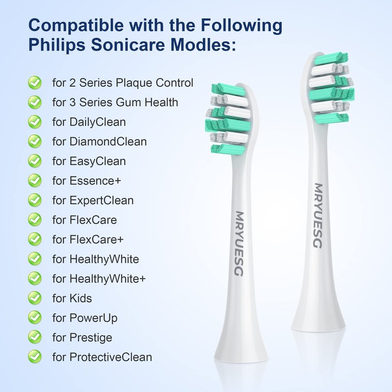 - Wide Compatibility & Easy Installation – MRYUESG replacement brush head for Phillips Sonicare are specially designed and perfectly compatible with Philips Sonicare 2 Series Plaque Control, 3 Series Gum Health, HealthyWhite, FlexCare, DiamondClean, ProtectiveClean, EasyClean and other snap-on Electric toothbrush Handles.