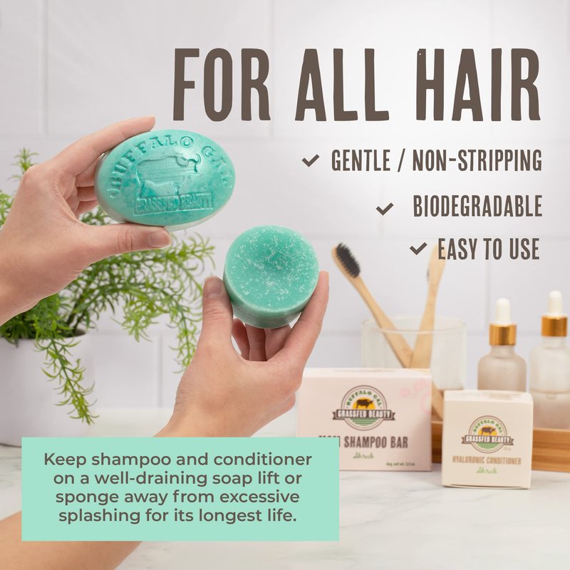 - Get Soft & Manageable Hair - Say goodbye to dry, frizzy hair with our shampoo and conditioner bar set. This all-natural duo includes our bar conditioner for hair enriched with hyaluronic acid, doubling as a hair serum that promotes visibly nourished locks!