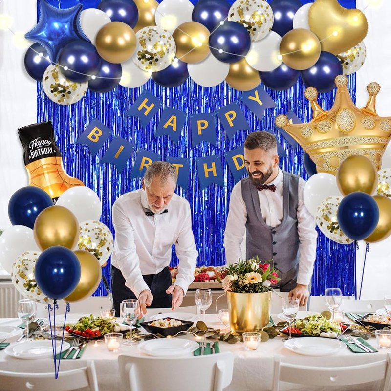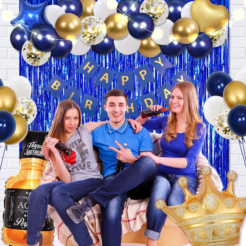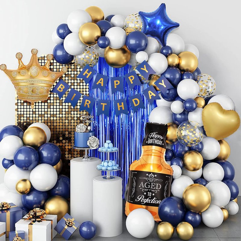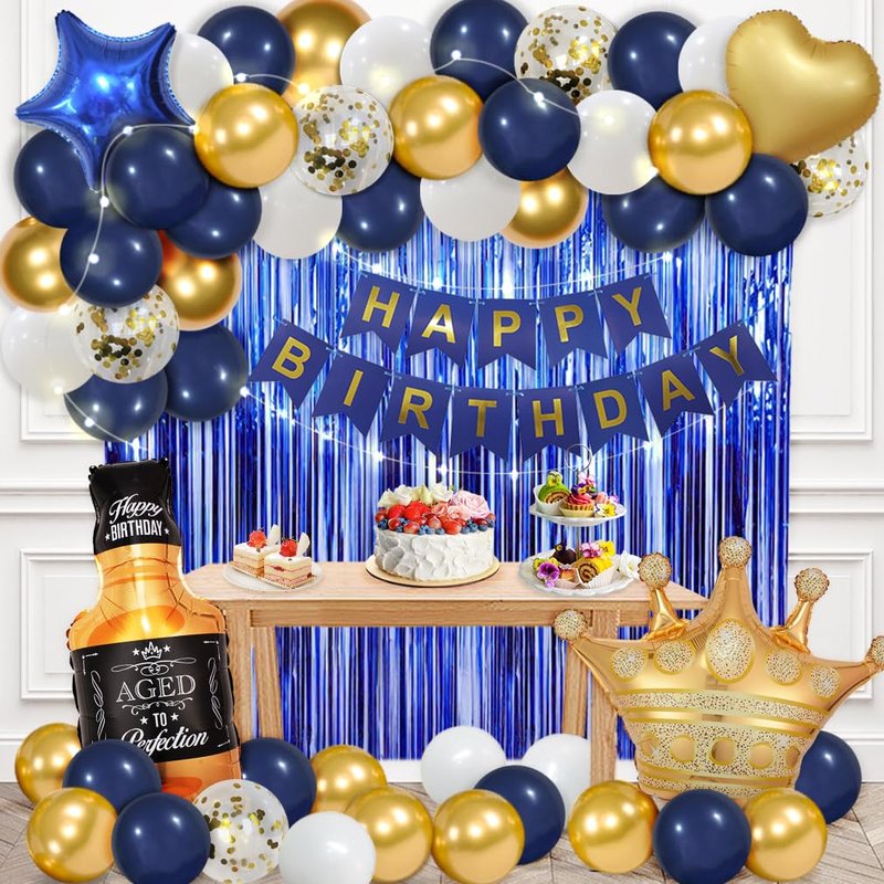 - Package including:1pcs HAPPY BIRTHDAY banner, 2pcs 3.3ft * 6.6ft foil curtains, 1pcs Whiskey bottle balloon, 1pcs gold crown balloon, 1pcs 18inch navy star, 1pcs 18inch gold heart, 40pcs 10inch latex balloons (navy, gold, white), 5pcs 12inch confetti balloons, 1pcs 9.8ft LED lights, 1pcs balloon chain, 1pcs glue dot,1pcs straw, 1pcs ribbon