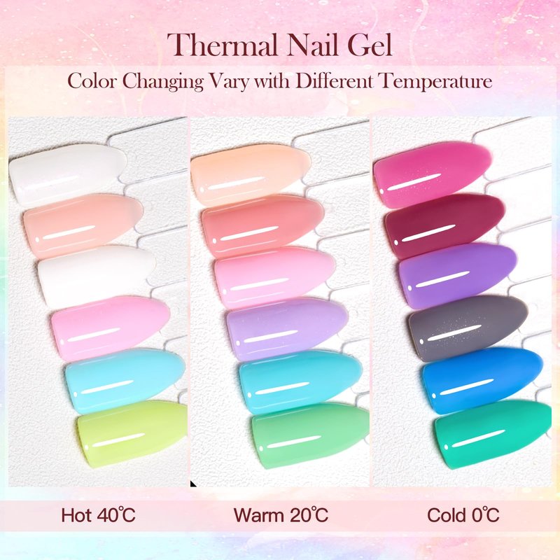 - 【PACKAGE CONTENTS】Include 6 Bottles 8ml color changing gel nail polish. 3 sections temperature color changing effect. Colder and longer nails, the color changing effect will be stronger and clear.