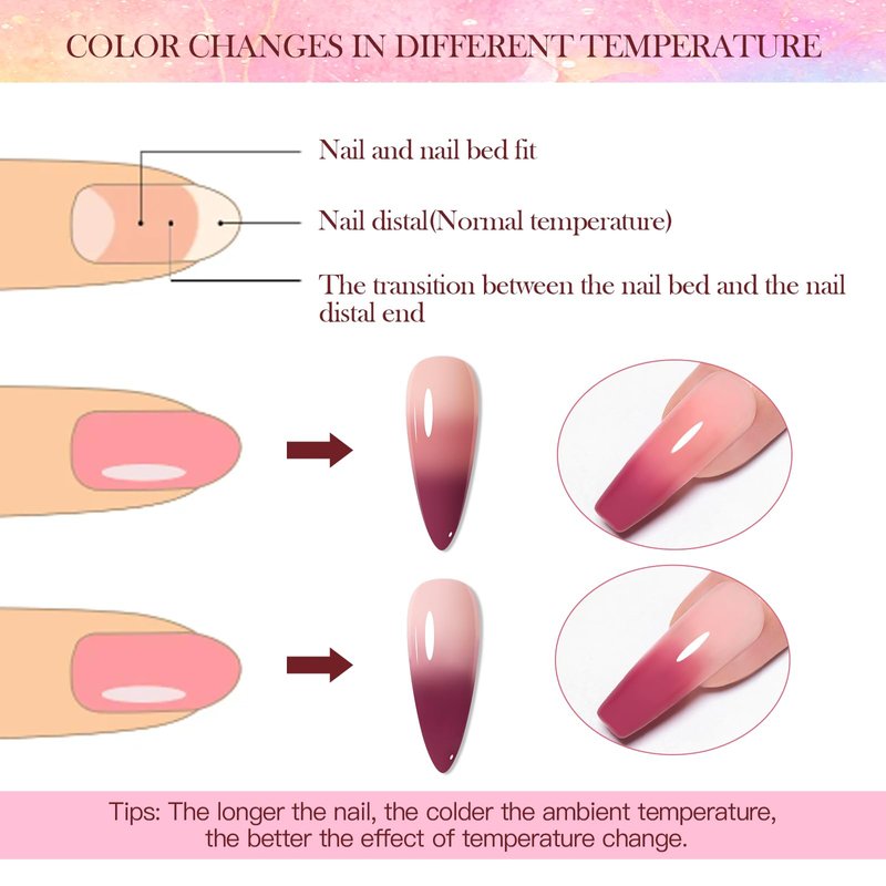 - 【COLOR CHANGING EFFECT】With color change gel nail polish, your nails will get different colors at different temperatures in cold, warm and hot. These colors amazingly change with your body temperature and environmental temperature. It will be more obvious on long nails get three color sections.