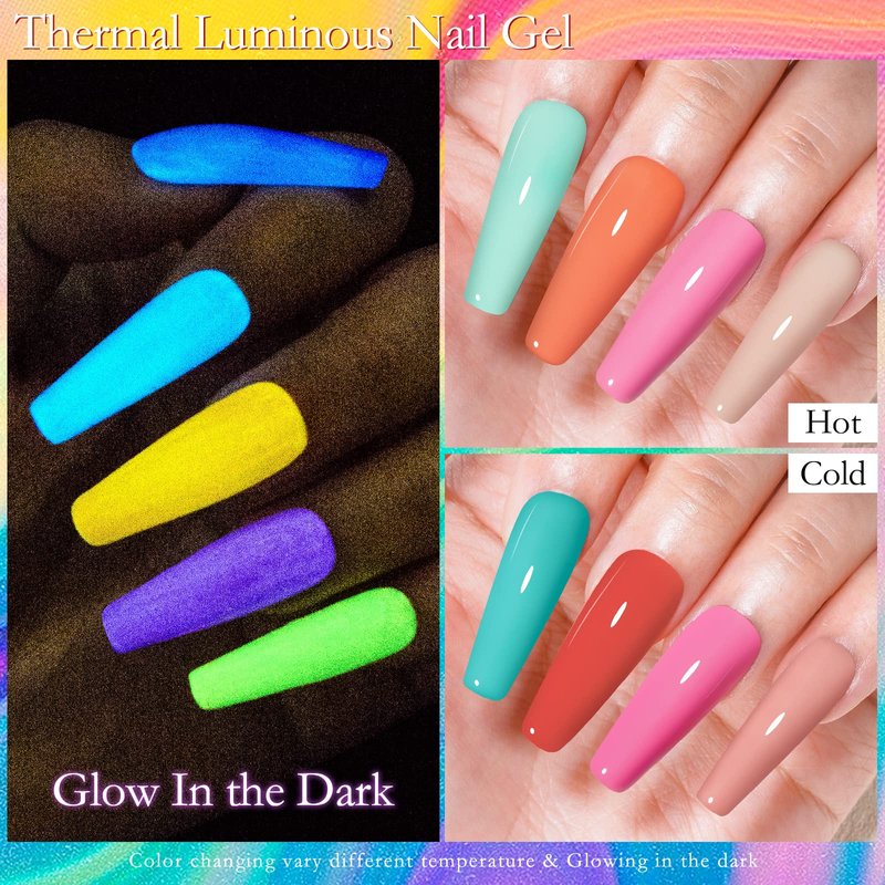 - 【SAFE & LONG-LASTING】Temperature mood change luminous gel nail kit is made from natural resin, non-toxic formula and lasts for 2-3 weeks while matching with base gel and top coat; with little odor, rich color, middle consistency, self-evenly, no shrink and edge. No chips or smudges, not peeling off easily.