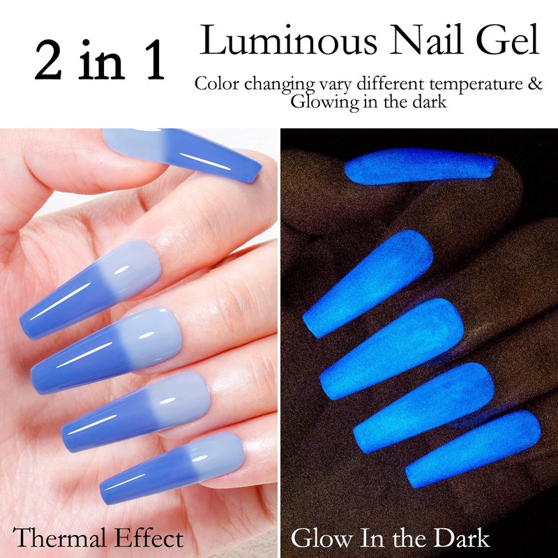 - 【GRADIENT EFFECT & GLOW EFFECT】With the glow in the dark thermal gel nail polish, your nails will get two different colors at temperatures below 15 ℃ or above 35℃. And the soak off nail gel polish has a luminous effect. It can shine at night, making you the most charming person at the party.