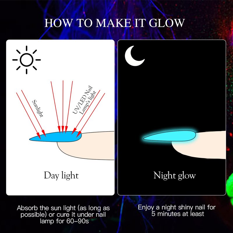 - 【Healthy Ingredients】The glow in the dark gel polish is made with safe resin ingredients that don't hurt your nails, has a low odor. Only used for nail and Non-direct contact with the skin. Wash immediately if contact occurs.