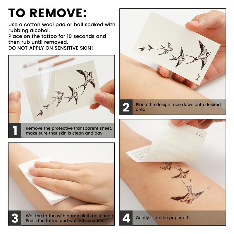 MSUP Temporary Tattoos 60 sheets, 3.81" x 2.24" EASY TO USE: 1. Remove the protective transparent sheet. MAKE SURE THAT SKIN IS CLEAN AND DRY. 2. Place the design face down onto desired area. 3. Wet the tattoo with damp cloth or sponge. Press the tattoo and wait 30 seconds. 4. Genlty slide the paper off.