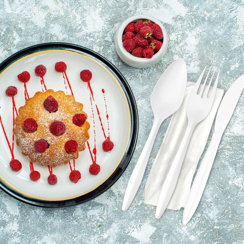 - Each heavy-duty plastic forks and spoons utensil pack includes a wrapped knife, fork, and spoon, ensuring cleanliness and preventing loss. A must-have disposable cutlery set!