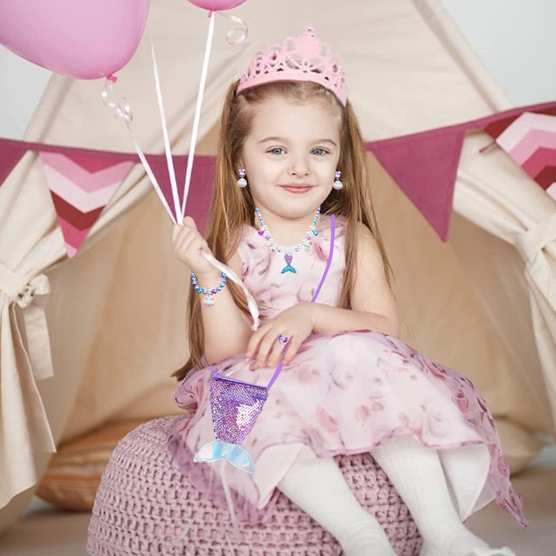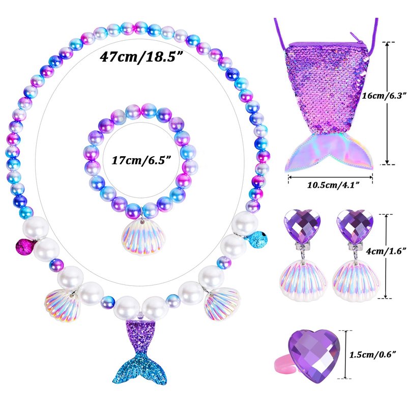 - Mermaid Party Costume Dress Up Jewelry Mermaid Gift for Little Kids - MTGOCHA kids mermaid play jewelry for toddler girls come with bling mermaid purse for toddler girls, pearl mermaid necklace for little girls, mermaid bracelet for girls,diamond ring,1 pair mermaid earring clip for girls, sparkle Mermaid jewelry kit with elastic string, easy to wear and take off. a charm mermaid play jewelry set for little girls mermaid party supplies.