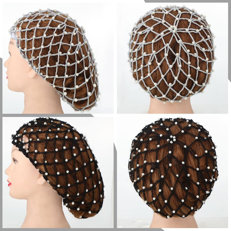 MTLEE 2 Pieces Snoods for Women Hair Mesh Crochet Hair Net with Pearl Rayon Hairnet Hair Wrap Hair Cover Ornament Rayon Knit for Sleeping (Black, Gray)