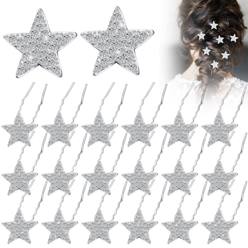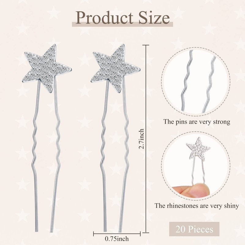 Features:As ideal present: You can send bridal hair pins to your girlfriend, wife, mother, etc. For birthdays, anniversaries, Valentine's Day, Mother's Day or any other festivals. They can also be applied as a gift for employee welfare, company league building, Memorial Day, trade fair, housewarming and other occasions.Highlight of dressing up:The wedding hair clip can be worn on the side or back of the hair, suitable for most hairstyle, the headdress is charming and delicate enough to be the highlight of your dressing.Specifications:Material: rhinestone and alloyColor: as picture shownSize:Total length: 2.7 inchesStar length: 0.7 inchPackage includes:20 x Rhinestone hair pinsNotes:Manual measurement, please allow slight errors on size.The color may exist slight difference due to different screen displays.Pointed metal parts included, please keep away from children under 3 years old.