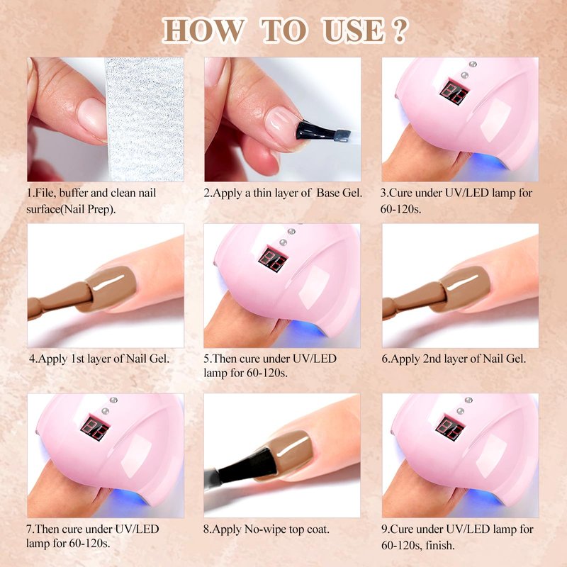 - EASY APPLICTION - This UV gel nail polish has good ductility and fluency make it easy to use even for beginners. This soak off UV/LED lamp gel nail polish needed to be cured under UV lamp (2-3 mins) or LED lamp (30-60 secs)