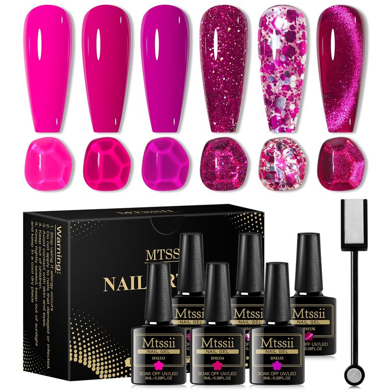 MTSSII Hot Pink Gel Nail Polish and Cat Eye Gel Nail Polish Spring Summer Hot Pink Red Purple Glitter Gel Polish for DIY Nail Art at Home