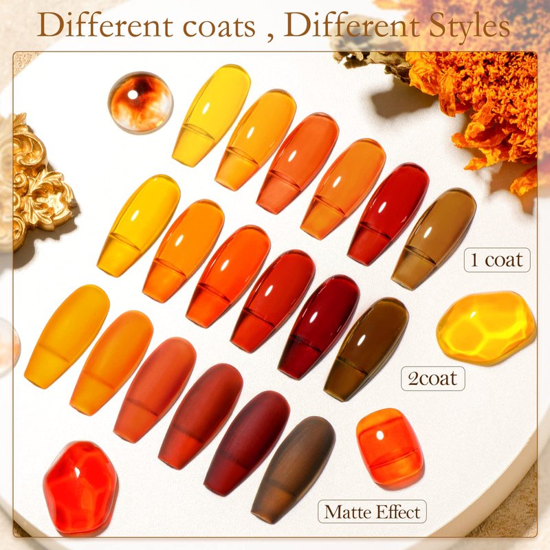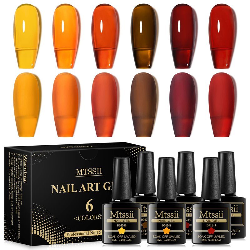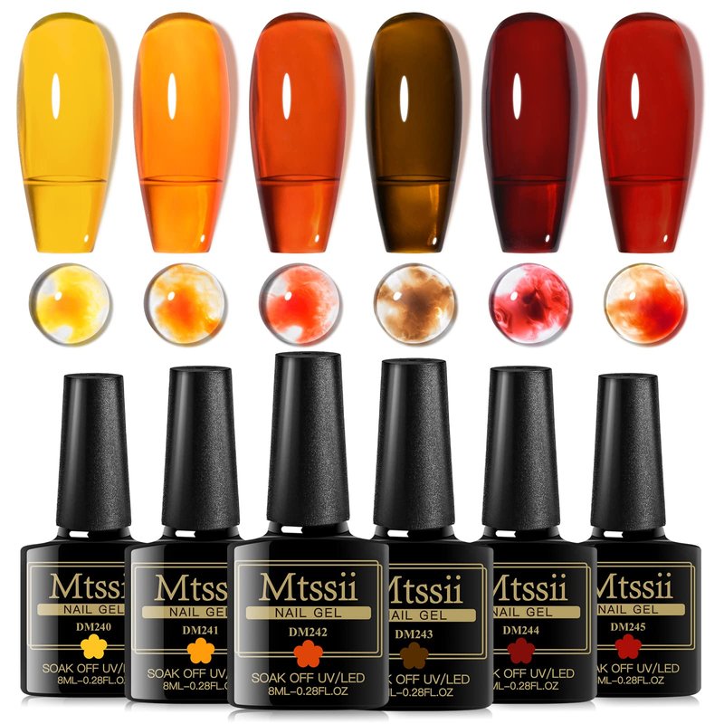 - RAINBOW GEL NAIL POLISH: Transparent and bright colors look like jelly crystal shoes are the highlights of this nail polish set. MTSSII 6 colors jelly gel polish which will gives your nails a glassy look enable us to easily create any different styles by combining with any other colors gel polish.