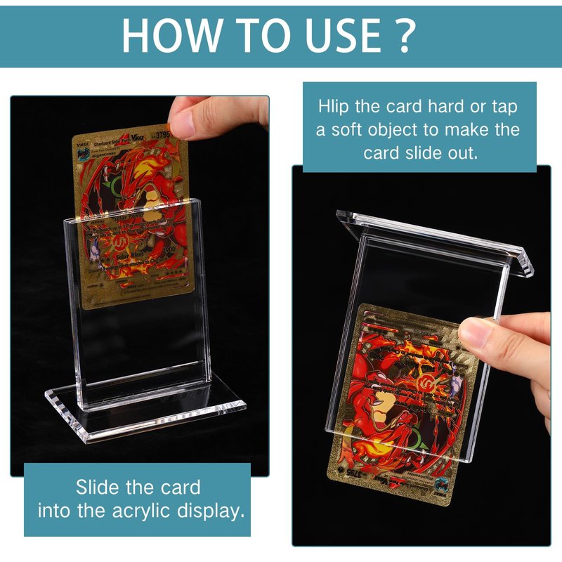 - Quality Material: crafted from clear acrylic, this trading card display provides Unmatched Clarity, don't take away from the card and card art; The card display stand has a smooth surface that is not only difficult to deform or bend but also resistant to dust, scratches, or water stains