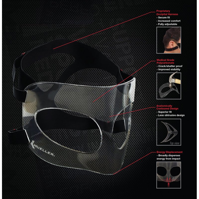 - FIT: One size fits most. For Men and Women. Made of crack/shatterproof medical-grade polycarbonate, the Mueller Face Guard is contoured to fit comfortably and to be less obtrusive