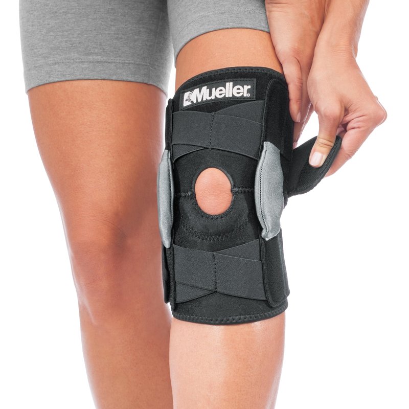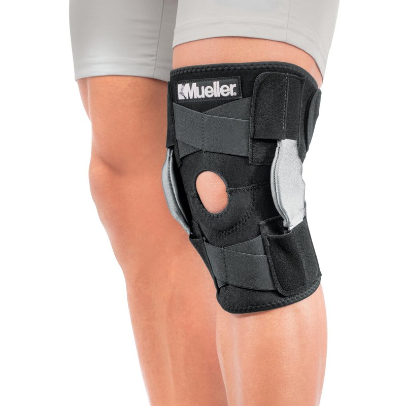 MUELLER Sports Medicine Hinged Wrap Around Knee Brace for Adults, Men and Women Knee Support for Pain, Injury, or Arthritis, Black/Gray,12-21 Inches, One Size Fits Most