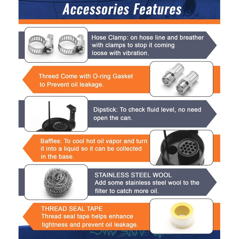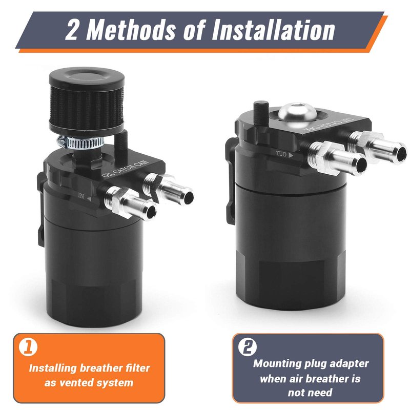 - 2 Types of Installation:Easy to install the baffled oil catch tank with breather filter as a vent system or without breather filter as a seal can, both for your option