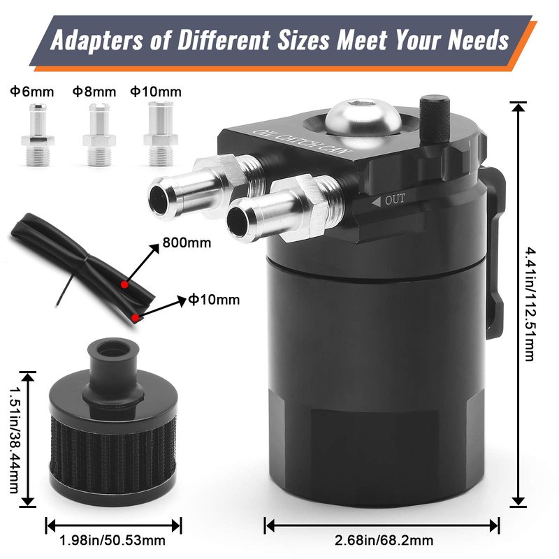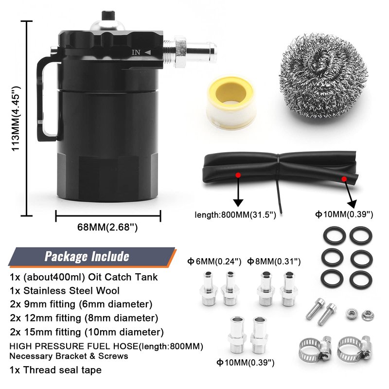 - Universal & 400 ml:The air oil separator catch can kit fits for most cars and small parts of motorcycles. And the capacity of the polish baffled reservoir is 400 ml, enough for daily use