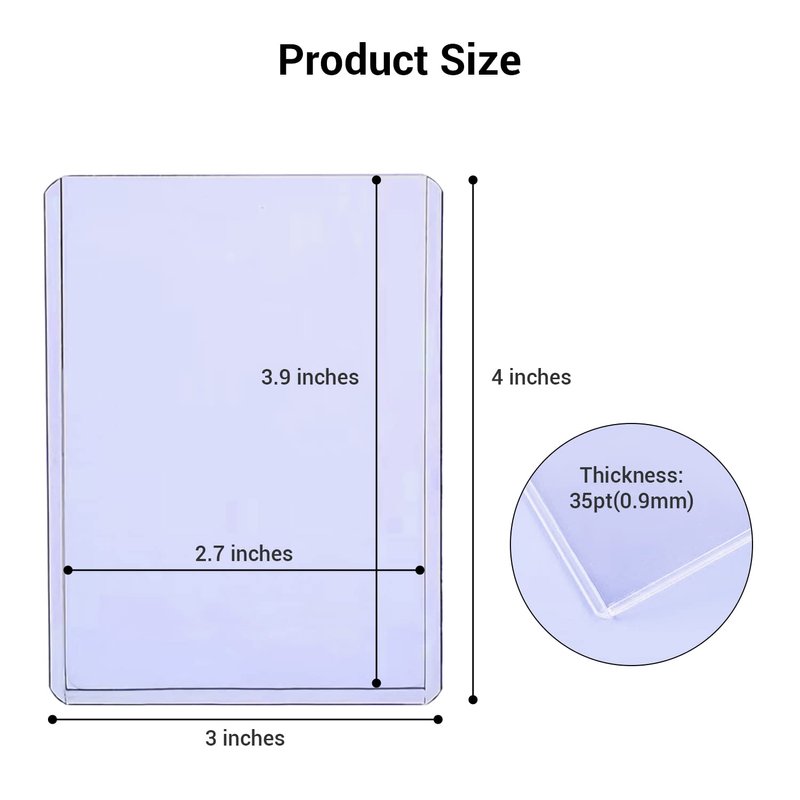 - Quantity & Size: 100 pieces of 3 x 4 inches ultra clear toploaders, which are designed to safely store standard size cards (2-1/2" x 3-1/2") up to 35 points in thickness.