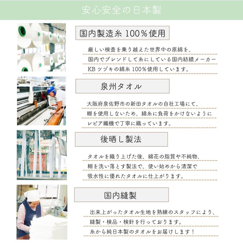 - [Excellent water absorbency, a characteristic of Senshu towels] After bleaching method, which washes off the oil, impurities, and glue from the cotton after weaving the fabric, makes them highly water absorbent from the first use. *If possible, do not use fabric softener, as it alienates water absorbency. *Although it has excellent water absorbency, some customers may find them hard to wipe with because of the lack of pile (loop part of the towel). We appreciate your understanding.